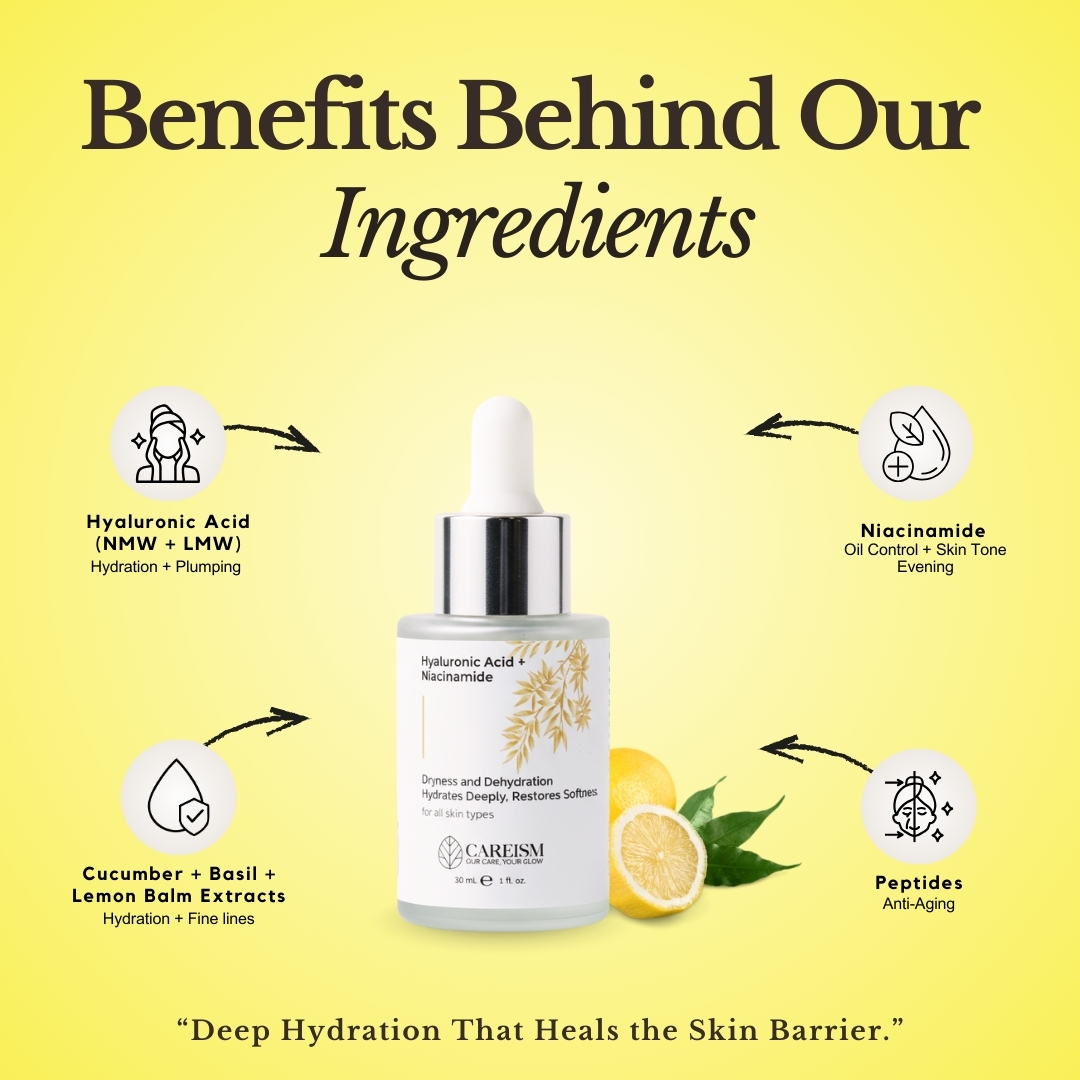 - Hyaluronic Acid (LMW + NMW) – Provides deep, long-lasting hydration and plumps the skin.
